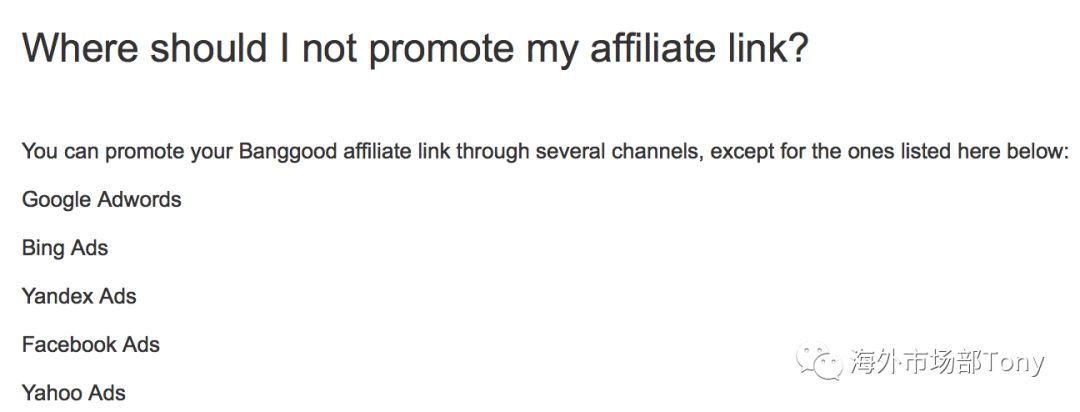 上面这张图是是棒谷(banggood)的联盟营销政策里的一条,他们为什么不允许联盟用户广告来直接推广联盟的链接呢?帮他们免费打广告还不好吗?
