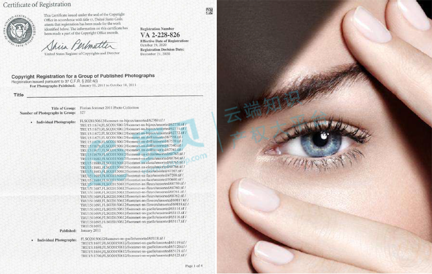 案件涉及 Florian Sommet在2011 年创作的包含 127 张照片的“Florian Sommet 2011 Photo Collection”版权作品,其中 “Eye Photograph”(女性模特手靠眼部的照片)是此次侵权的核心作品。赛贝提醒跨境卖家只有通过Trunk Archive付费获取授权,才能合法使用这些照片,任何未经授权使用都可能构成侵权。