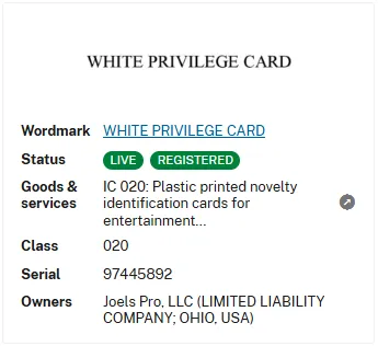 原告主要开发、生产、推广和销售带有该商标的娱乐用塑料印刷novelty身份证产品,此次维权的White Privilege Card仅用于娱乐目的的塑料印刷式新奇标识卡。