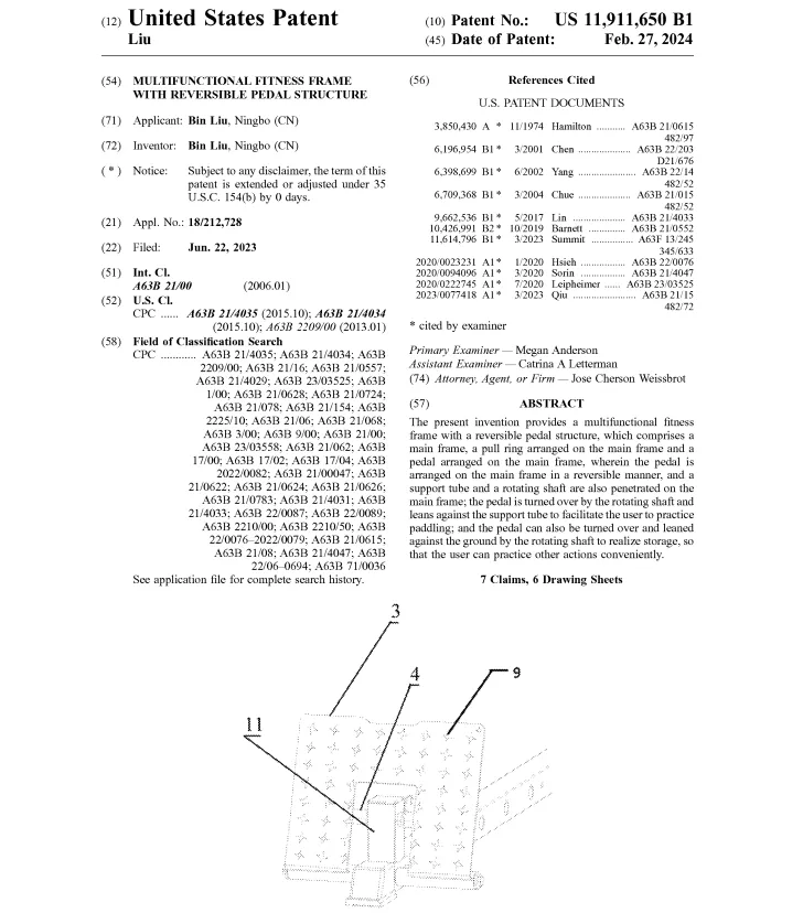24家店铺被告,涉及名为Multifunctional fitness frame with reversible pedal structure的美国发明专利,专利号US11911650B1,2023年6月22日申请,2024年2月27日下证,类似原理或结构均有侵权风险,无论外观是否相同: