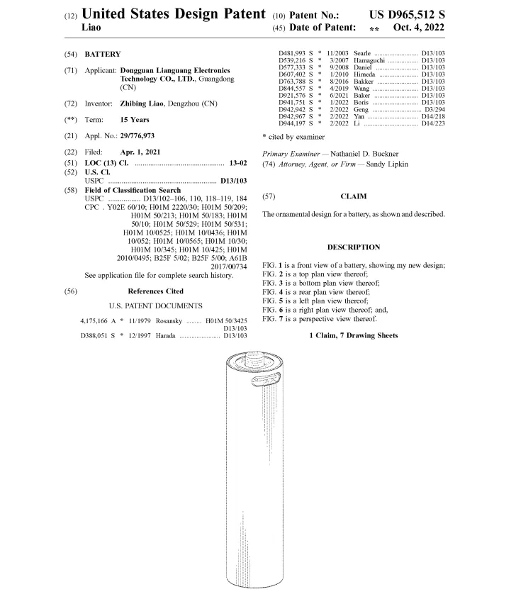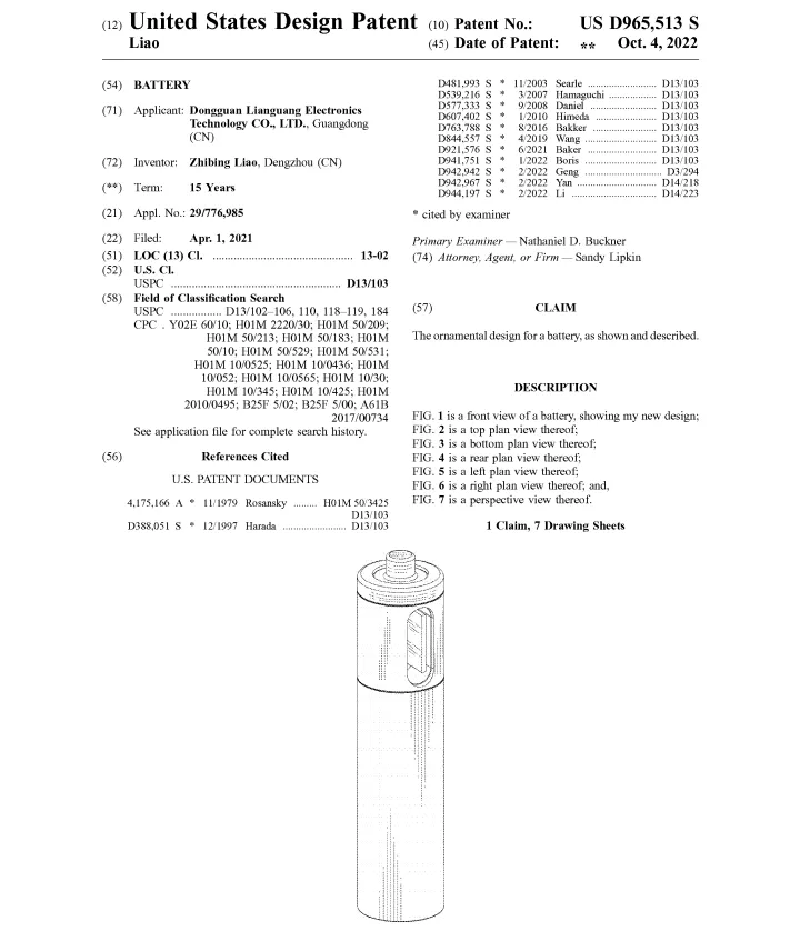 涉案产品为可充电电池,专利号USD965512S、USD965513S,有卖相关产品的卖家需注意规避,切勿销售与之高度相似的产品: