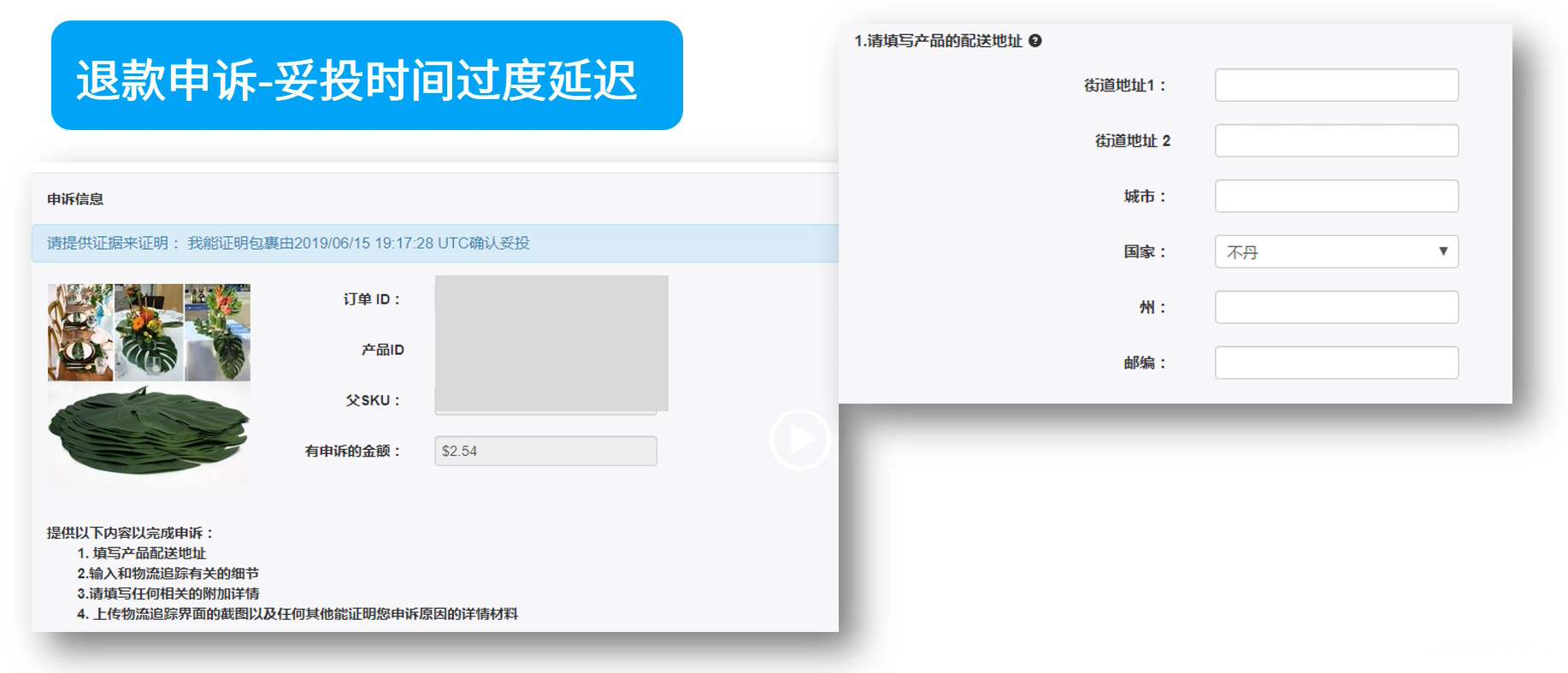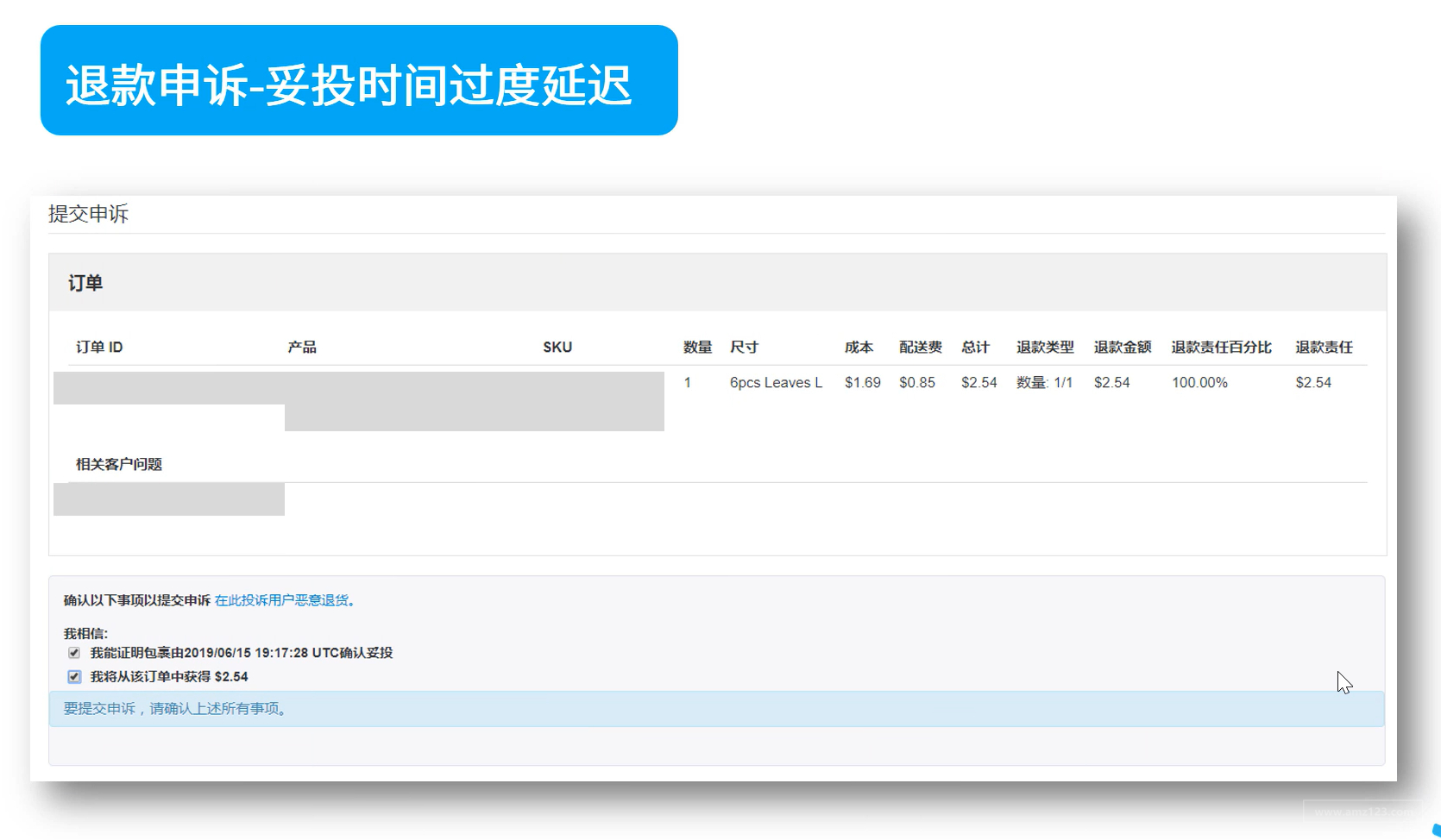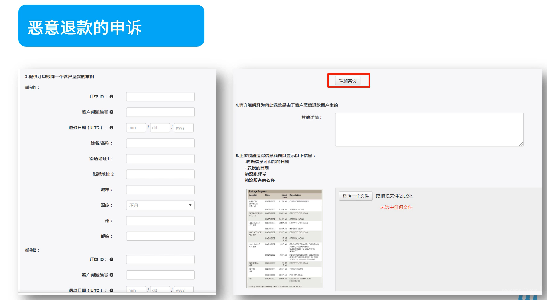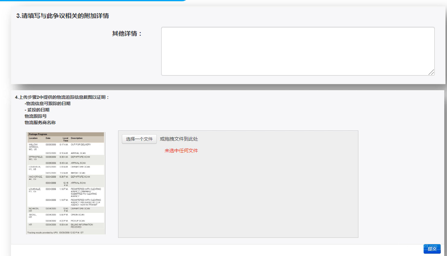 4、填写与此争议相关的附加详情,并上传步骤2中提供的物流追踪信息以证明妥投时间未过度延迟。
