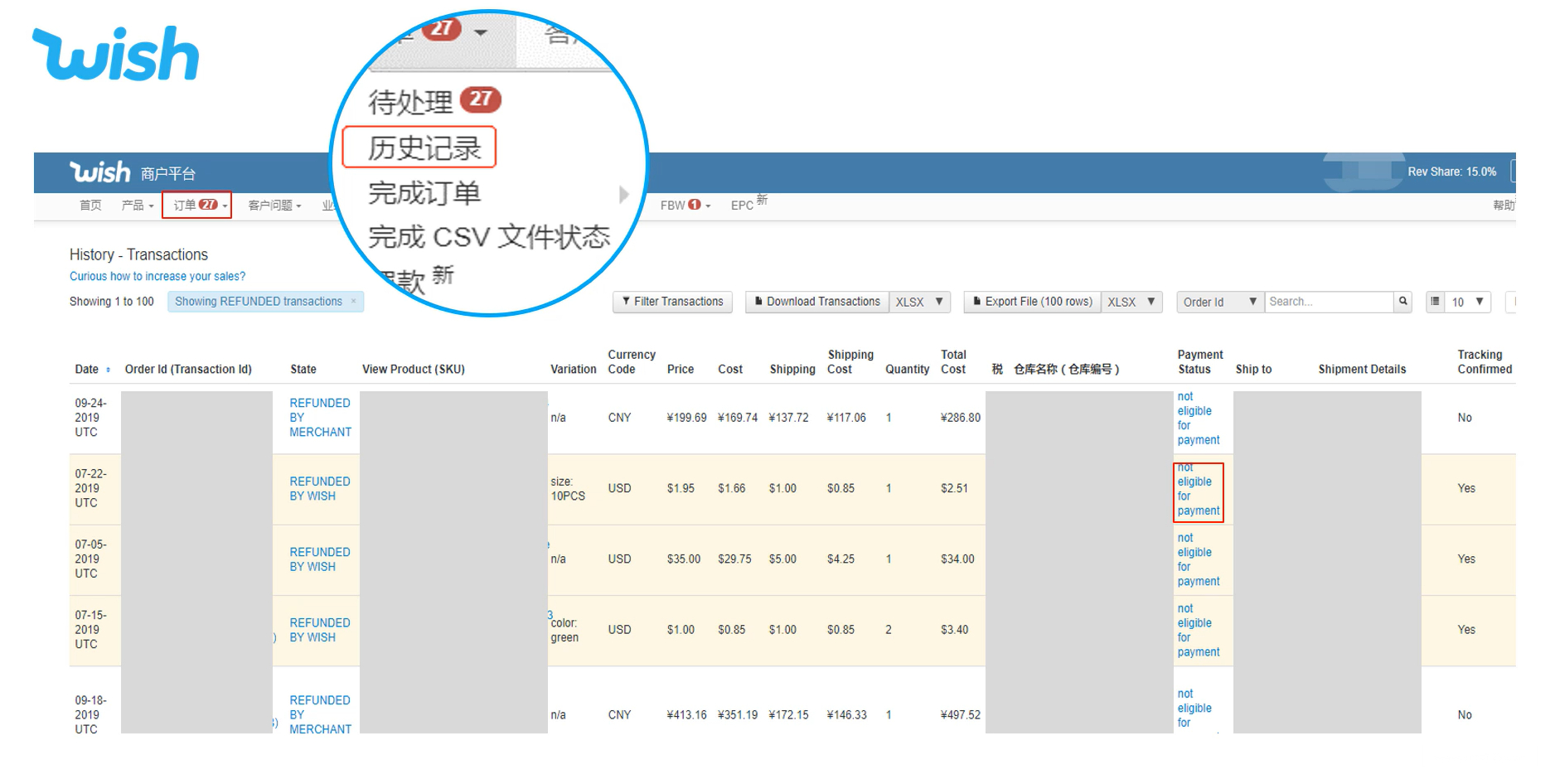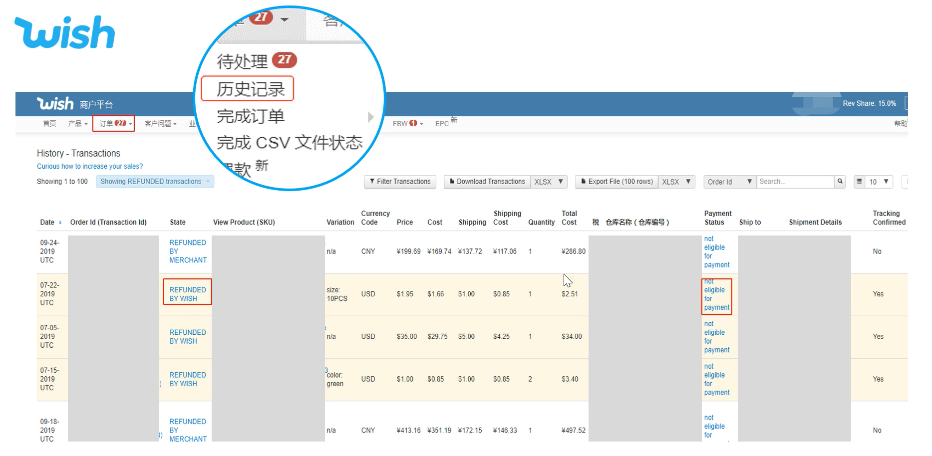 1、点击“订单”--"历史记录“,然后点击下图所示表中的两个框。,即可查看买家退款原因。