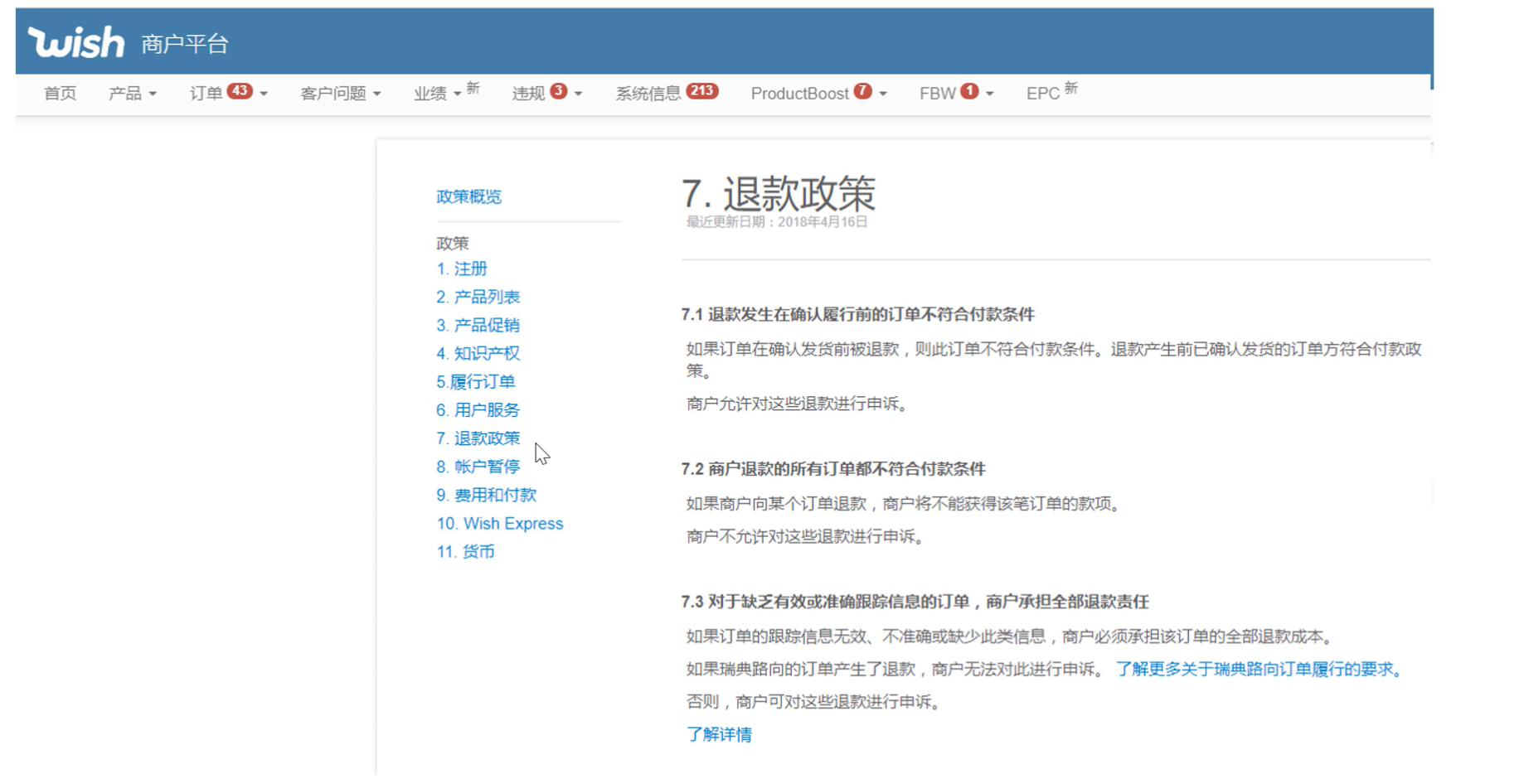1、在Wish商户平台页面点击“帮助中心“--“Wish政策”--“退款政策”,即可查看。