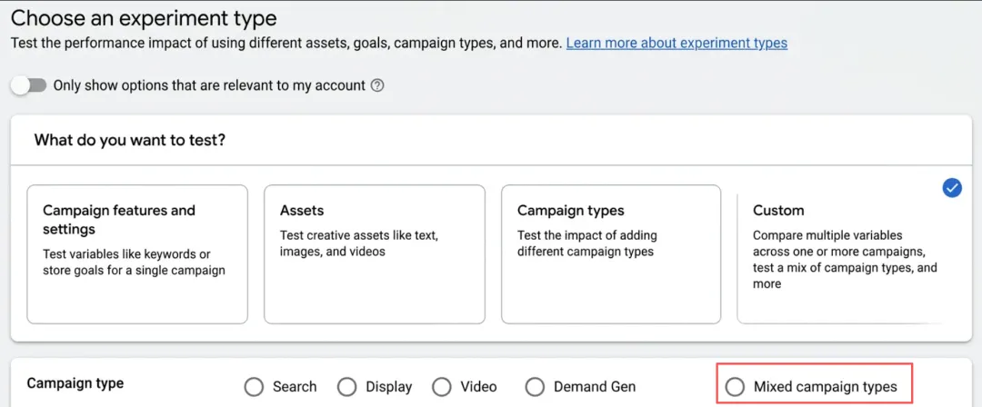 现在,在"自定义实验"下,你会看到一个名为混合广告系列类型(Mixed Campaign Types)的新选项。
