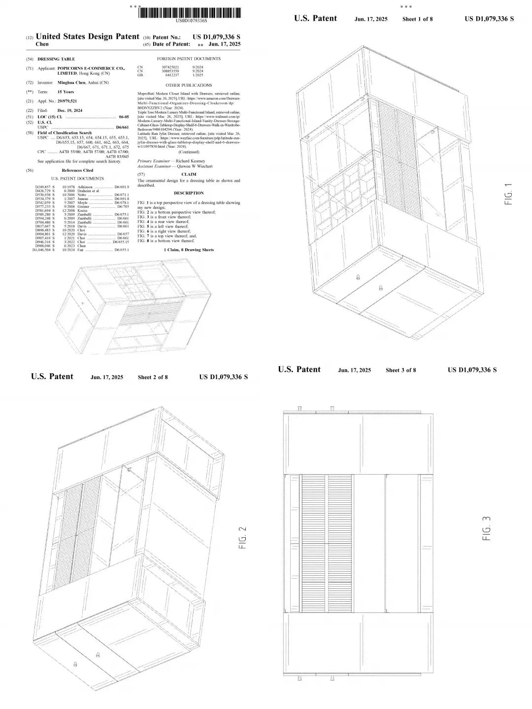 本案涉及外观专利维权,专利号USD1079336S,于2024年12月19号申请,2025年6月17号下证,外观细节如图所示: