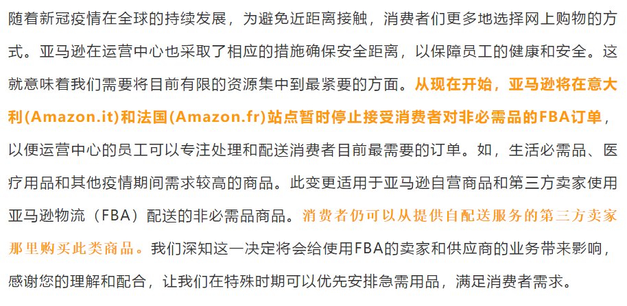 3月22日,亚马逊紧急发出以下通知:亚马逊将停止在意大利和法国站点暂时停止接受消费者对非必需品的FBA订单。(内容如下)