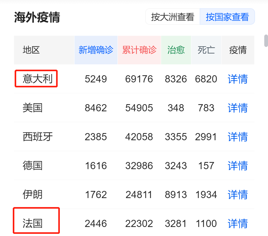 截止至北京时间3月25日11:00,意大利累计确诊69176,法国累计确诊22302,每日都新增确诊千人以上。疫情每日加剧,死亡人数居高不下,欧洲现处水深火热之中。