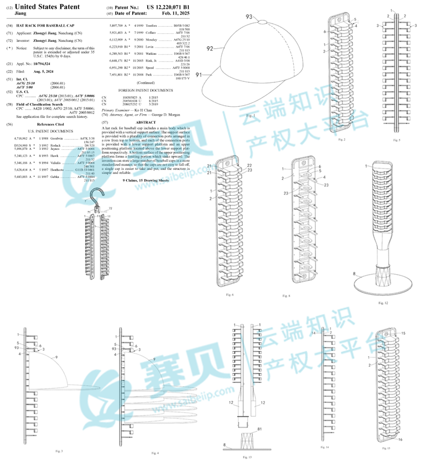 本次案件涉及一项美国发明专利 US 12,220,071 B1,申请日期为 2024 年 8 月 5 日,授权日期为 2025 年 2 月 11 日。该专利保护一种用于棒球帽的帽架,其核心结构为:主体设有垂直支撑面,其上排列多个连接端口,每个端口包含下支撑平台和上定位平台,上定位平台底面形成向上凹陷的限位部,通过与棒球帽顶扣的配合实现稳定存储。赛贝提醒跨境卖家若销售相关产品,需仔细比对该专利独立权利要求(如双主体背对设置、挂钩与第一通孔的连接结构等),避免因产品结构包含 “垂直支撑面 + 多连接端口 + 限位部” 等核心特征而构成侵权。