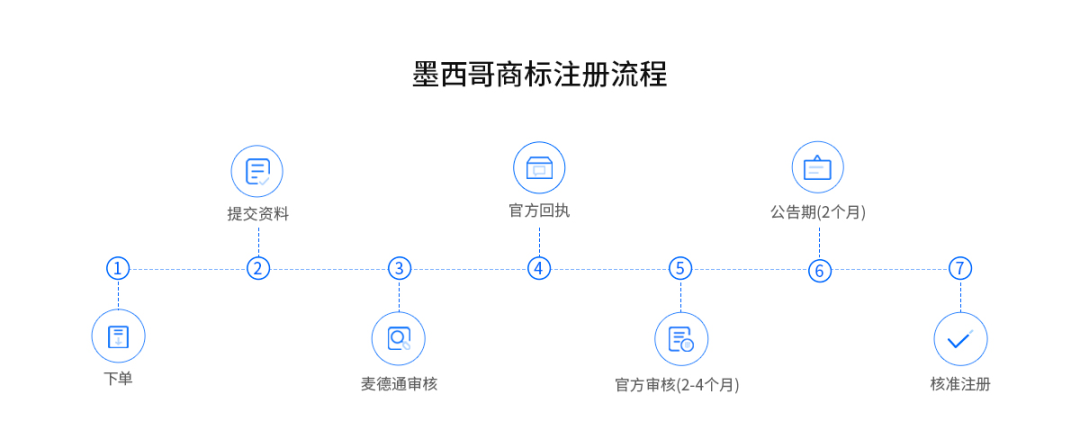 3.商标审核评估:麦德通将提交的申请资料提供给律师,律师进行初步审核后提交至墨西哥工业产权局;