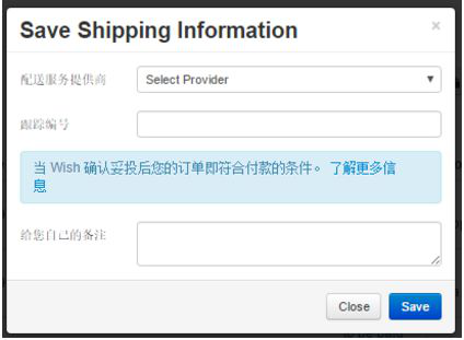 对未处理订单点击“配送”之后,会出现什么样的界面?不需要确认妥投的订单和需要确认妥投的订单在点击“措施”->“配送”后的页面,出现的Save Shipping Information界面有所不一样。