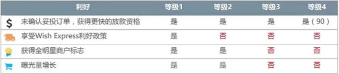 等级1:满足Wish Express妥投要求的Wish Express订单的商品,或选择某一等级1物流服务商发货的商品,可享受等级1的利好政策。