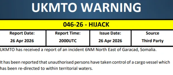据英国海上贸易行动办公室(UKMTO)通报,4月26日,一艘圣基茨和尼维斯旗、土耳其管理的通用货船Sward轮(IMO9174244)在加拉阿德东北约6海里处被武装人员登船控制。