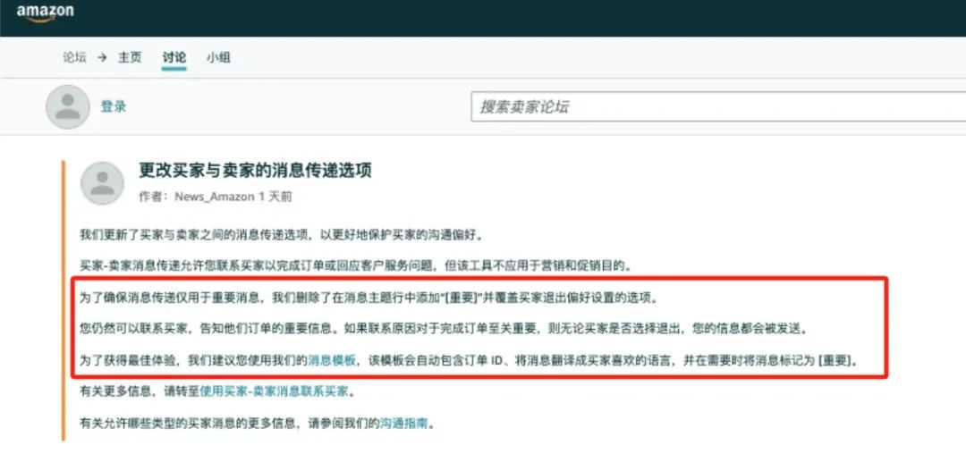 现在,这一权限已由亚马逊系统自动接管,仅当消息涉及订单必需信息,如发货延误通知、收货地址错误更正、质量问题召回协商等关键情况时,系统才会自动将消息标记为“[重要]”,并确保买家能够接收到。