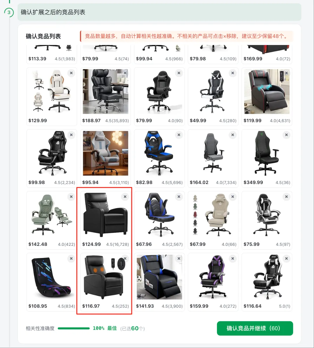 第二个节点是筛选竞品池:系统扩展出来的竞品里,一定会混入购买意图不同的产品——比如游戏椅的竞品池里,出现了按摩椅和家用沙发椅。这类不相关的产品,必须手动剔除,否则后续词库的相关性判断会被直接污染。