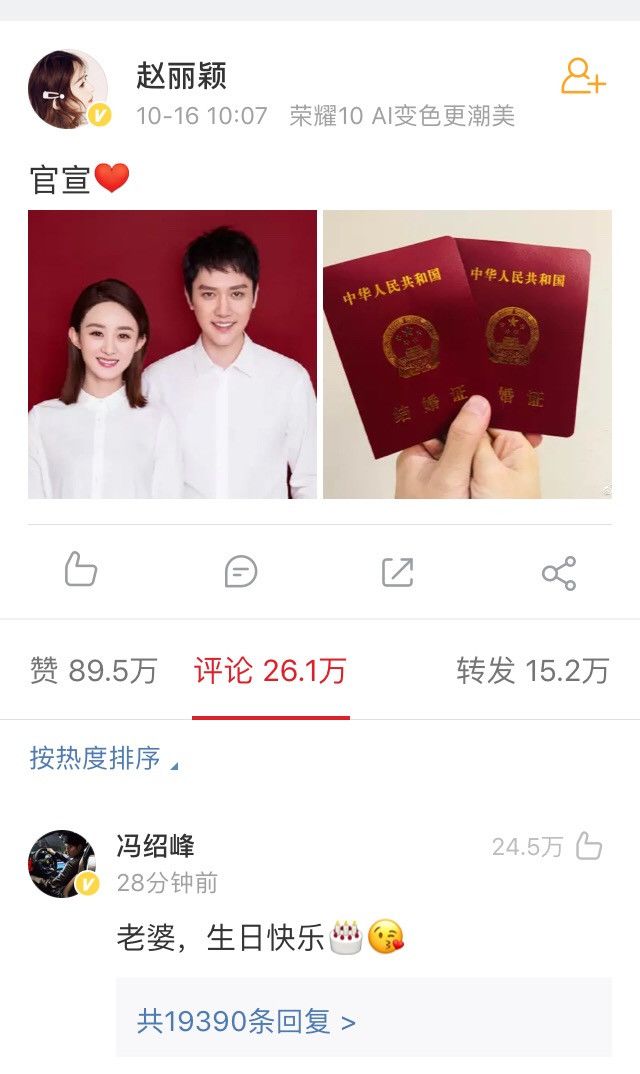 今早,新浪微博又崩溃了,因为赵丽颖冯绍峰在微博直接晒出了结婚证,并配文“官宣”。除此之外,微信文章也是一篇又一篇的10W+爆款!仿佛全中国人都在关注着这两个人的婚姻!