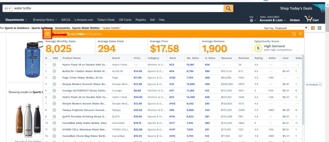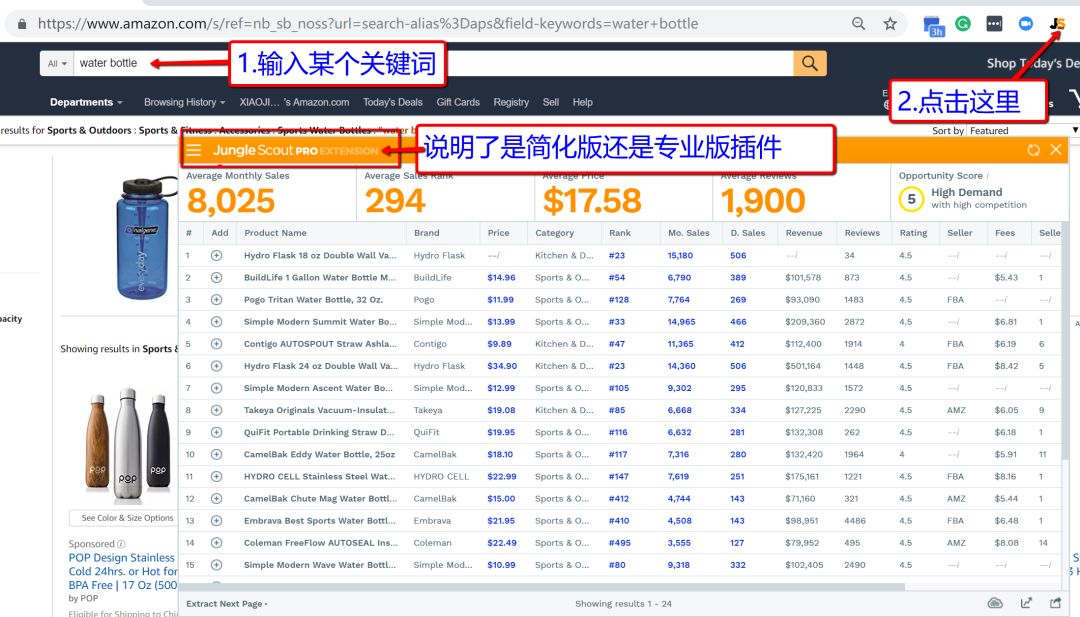 打开亚马逊网站,输入某个关键词,再点击JS图标,眨眼之间,插件就把这个页面上的产品数据都刷出来了!