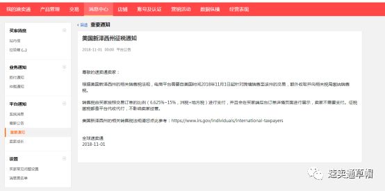 近日,从速卖通后台获悉,阿里巴巴全球速卖通于2018年11月1日发布美国新泽西州征税通知,且于美国时间2018年11月1日起正式执行。