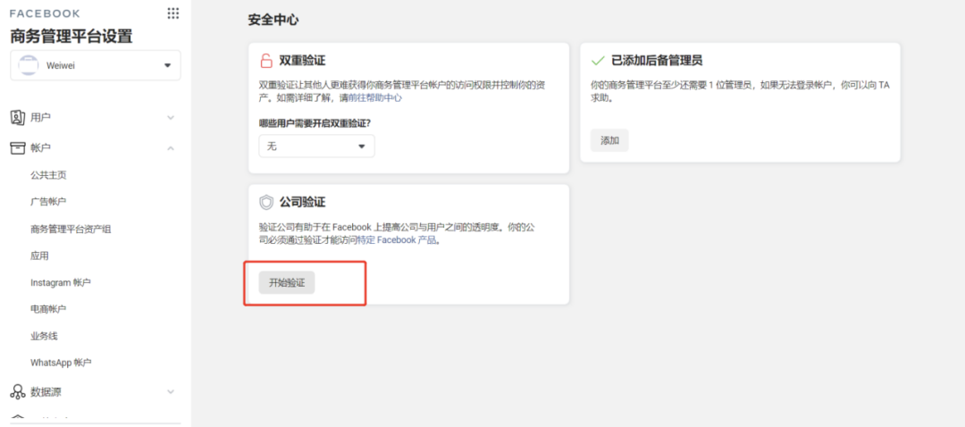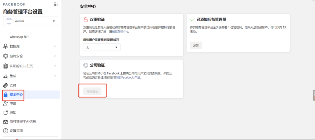5、返回绑定的BM商务管理平台设置界面,找到公司验证,刷新界面,可看到验证按钮处于可点击的状态,根据提示进行验证即可: