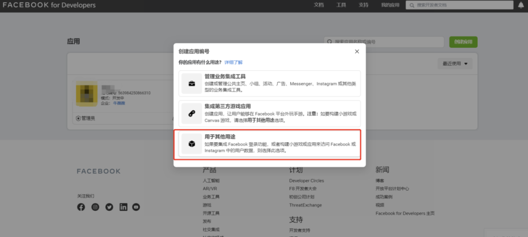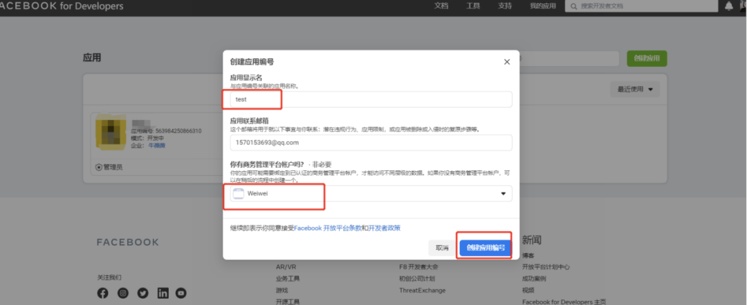 4、填入应用名称,选择要绑定的BM,点击创建应用编号:
