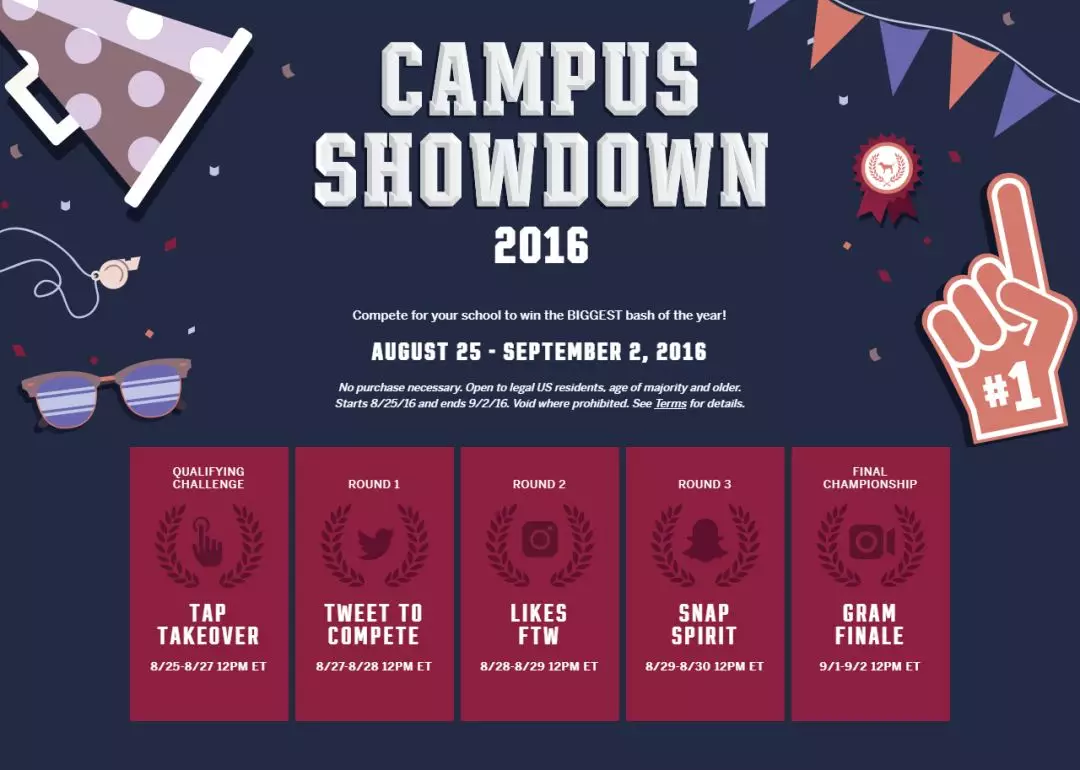 那么全美这么多所学校,哪一间能成为派对举办地呢?维密巧妙地把举办地设为一个竞争项目,让各校进行线上投票比赛,排名最前的则成为Pink派对举办地~