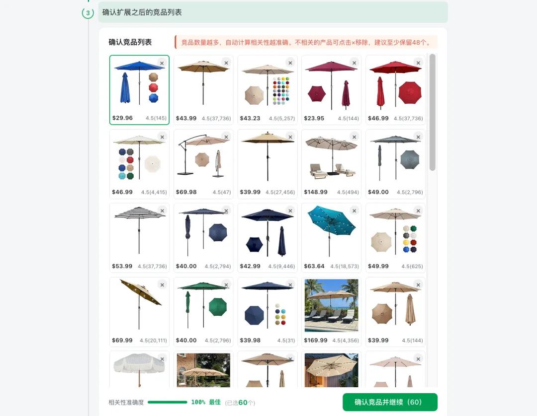 也就是说,新品阶段更建议把竞品池控制在 35–50 个以内,而不是一开始就把 60 个竞品全部拿来拓词。