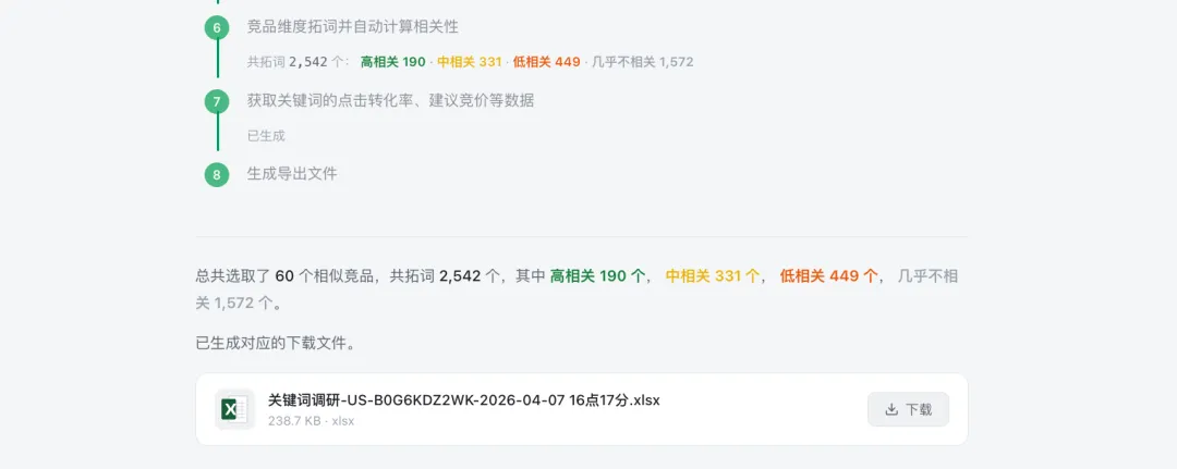 5.我输入ASIN后,AI最终选取了 60 个相似竞品,共拓词 2,542 个,其中 高相关 190 个, 中相关 331 个, 低相关 449 个, 几乎不相关 1,572 个。