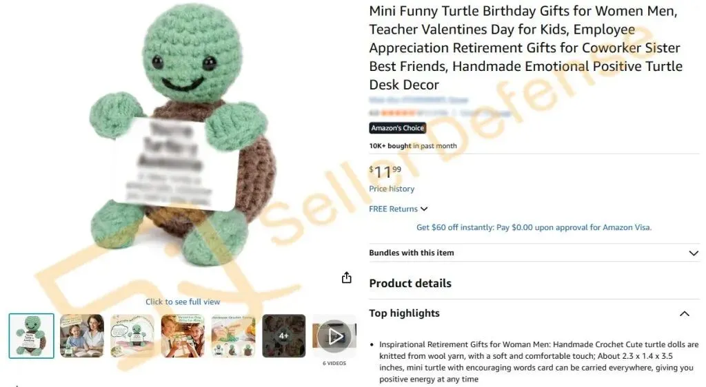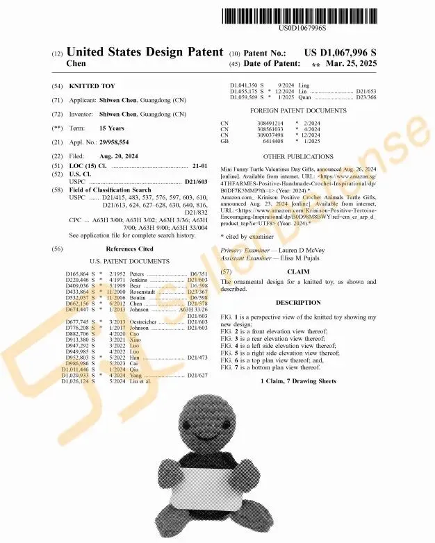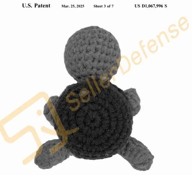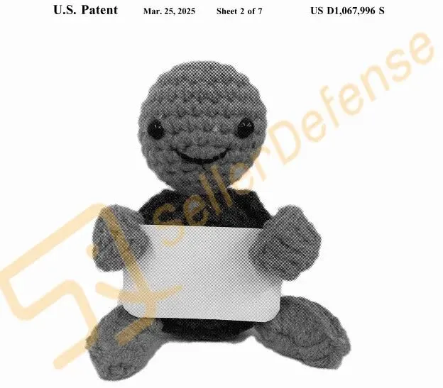 本案为国人原告,案件涉及专利如下是一款钩针乌龟玩偶,仍有众多同款产品请玩具卖家注意排查避雷!