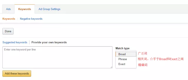 很多知名品牌都是使用broad广泛词来做,然后投放几天之后就要开始你的关键词报告,从中挑选“热搜词”与“转化率”高的词,做精准词的广告。