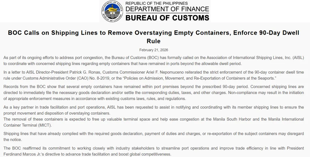 2月22日,为了解决长期困扰马尼拉港口的拥堵难题,菲律宾海关局(BOC)近期正式出重拳整治。明确要求各航运公司必须严格遵守现行的管理规定,尽快处理掉在港口超过90天的空集装箱。