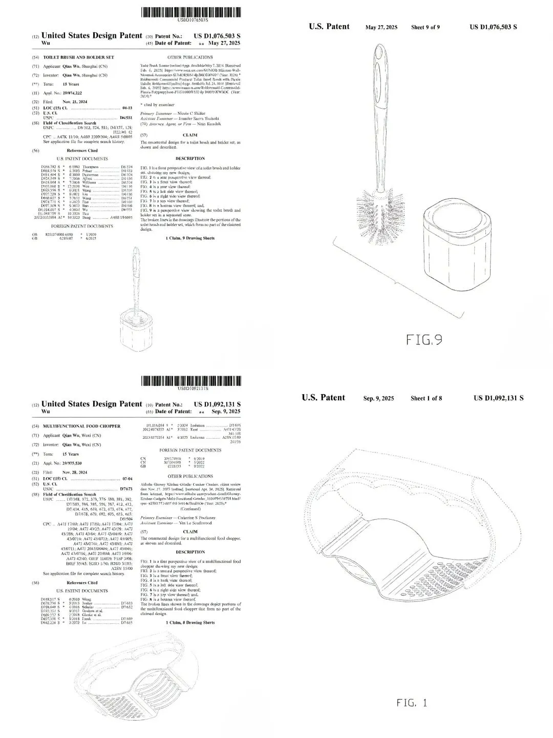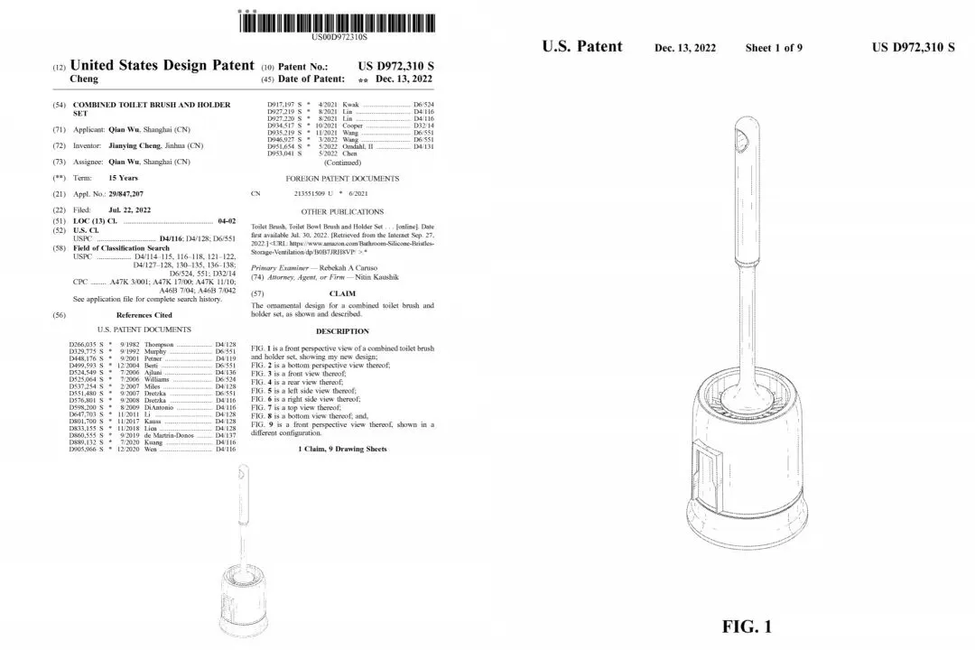 原告Qian Wu是一位来自上海的国人卖家,他是美国外观专利“马桶刷及支架套装”的发明人。