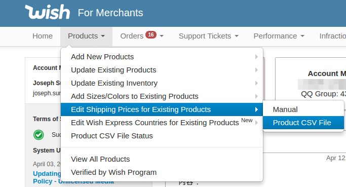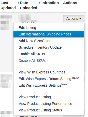 表2:瑞典基于“最高变量价格”的许可的价格增长表 如果产品针对瑞典已经设置了国际运费,则可根据产品的“最高变量价格”的阈值上限(见表2)上调运费。 示例3-已设置瑞典路向的国际运费: 商户的促销产品C,共有三个SKU,价格分别是2美元、3美元、4美元,产品设置了瑞典国际运费,为5美元;则该产品瑞典的“最高变量价格”是4+5=9美元。 对比表格2,产品C的瑞典运费允许上调的阈值是1.99美元,即产品C的瑞典路向的运费最高可上调至5+1.99=6.99美元。 如果产品未针对瑞典设置国际运费,则根据该产品的“最高变量价格”和现有的最高的SKU运费允许的增幅(见表2)为该国设置国际运费。 示例4-未设置国际运费: 商户的促销产品D,共有两个SKU,价格分别是3美元、4美元,产品设置的运费是4美元、5美元;则该产品的“最高变量价格”是4+5=9美元。 对比表格2,因产品D未曾设置国际运费,现在要设置瑞典国际运费,运费可上调阈值以表格“$8.01-10”一列为准,即产品B瑞典路向可设置的最高国际运费为5+1.99=6.99美元。 促销产品运费可以上调几次? 在可调整运费的期间内,商户可以为每项促销商品对每个配送国家(或地区)做一次运费调整。因为可调整的次数有限,建议商户仔细阅读政策,确定最佳运费额度,为各个路向,尤其是瑞典,设置合理的国际运费。 上调运费如何设置? 商户可以通过手动编辑、上传CSV和通过API上调三种方式进行运费调整。 手动编辑 若要为促销产品手动编辑国际运费,请在产品页面点击“措施> 编辑国际运费”。 上传CSV 若要通过CSV更新促销产品的国际运费,请打开“产品> 为现有产品编辑运费> CSV文件”。根据前文的指导,您可以在此上传“.csv文件”为您的促销产品更新运费。 通过API上调 若要通过API更新运费,请登录https://merchant.wish.com/documentation/api/v2#update-multi-shipping进行操作。