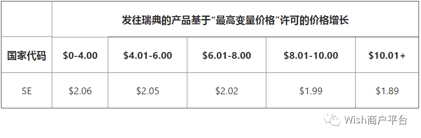 对于配送至瑞典的促销产品,设置的运费同样是根据“最高产品价格”做许可的价格增长,但增加幅度参见下表: