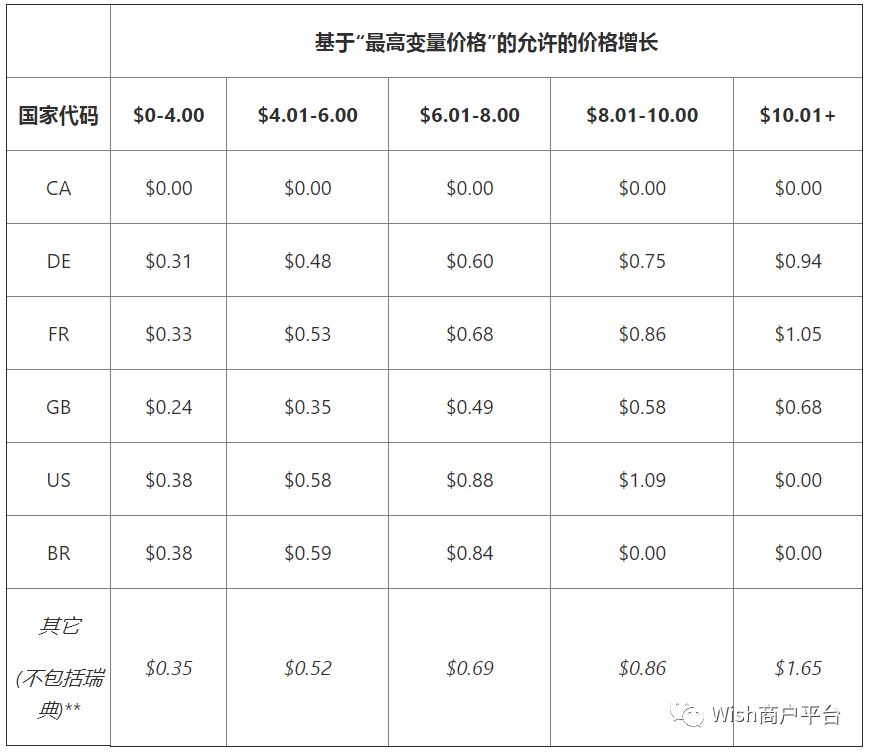 如果产品未针对某一国家(或地区)设置国际运费,则根据该产品的“最高变量价格”和现有的最高的SKU运费允许的增幅(见表1)为该国设置国际运费。