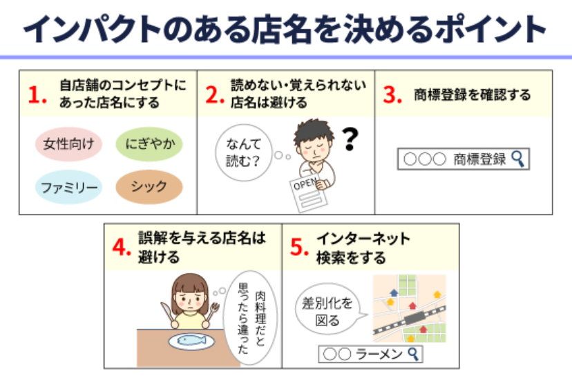 要点: 名称应尽量简短精炼。例如,“快適生活応援ショップスマイルライフ”中,“スマイルライフ”(Smile Life) 部分更容易被记住且有效。