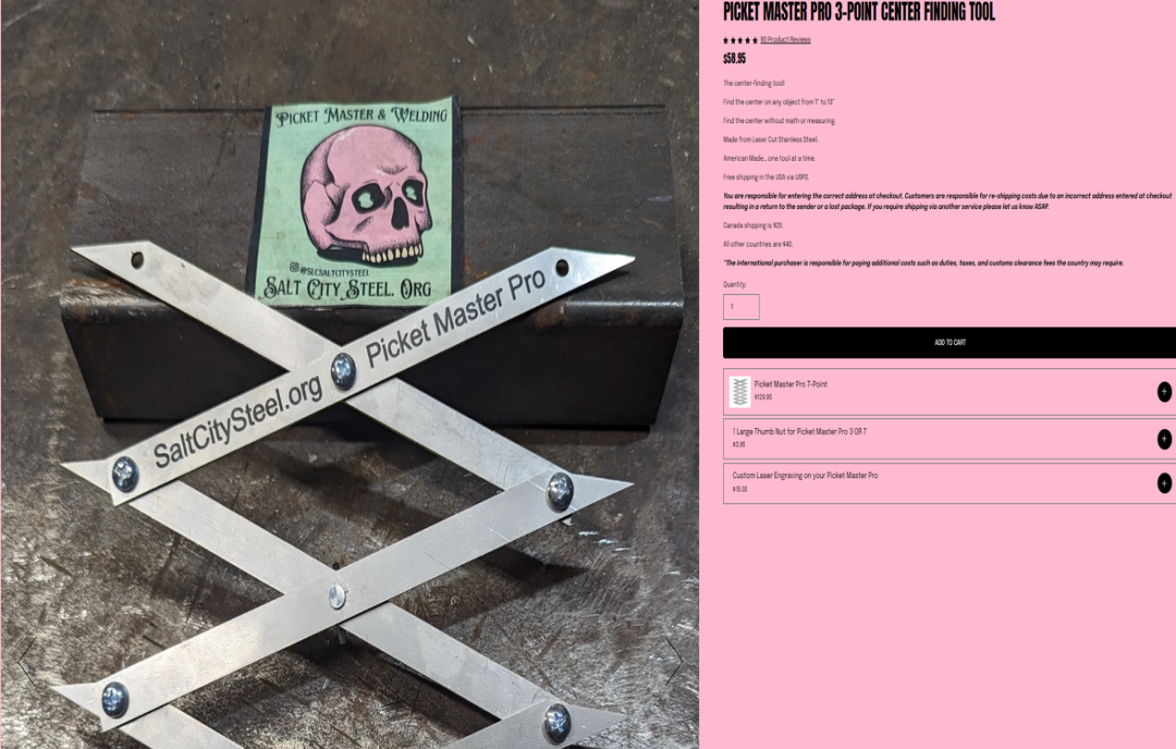 原告SALT CITY STEEL LLC是一家小型家族金属加工企业,总部位于美国犹他州盐湖城南区。SCS是创新等间距布局工具“Picket Master Pro”(简称“PM产品”)的官方制造商及经销商。该工具专为装饰性铁艺加工设计,可简化大门、栏杆、围栏及缝焊件的立柱间距布局,显著提升金属加工项目的效率与精度。所有PM产品均由原告在犹他州盐湖城市手工精心打造,确保卓越品质与耐用性。PM产品已成为SCS车间及全球众多工坊的标配。