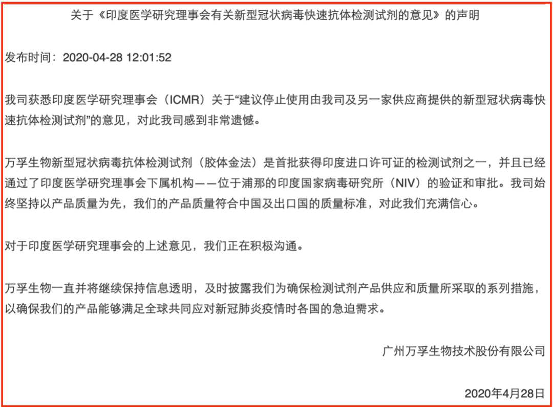 他们第一时间发布声明,表示“公司新冠病毒抗体检测试剂(胶体金法)是首批获得印度进口许可证的检测试剂之一,并且已通过了印度医学研究理事会下属机构——印度国家病毒研究所(NIV)的验证和审批。”