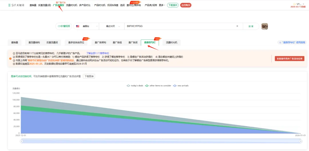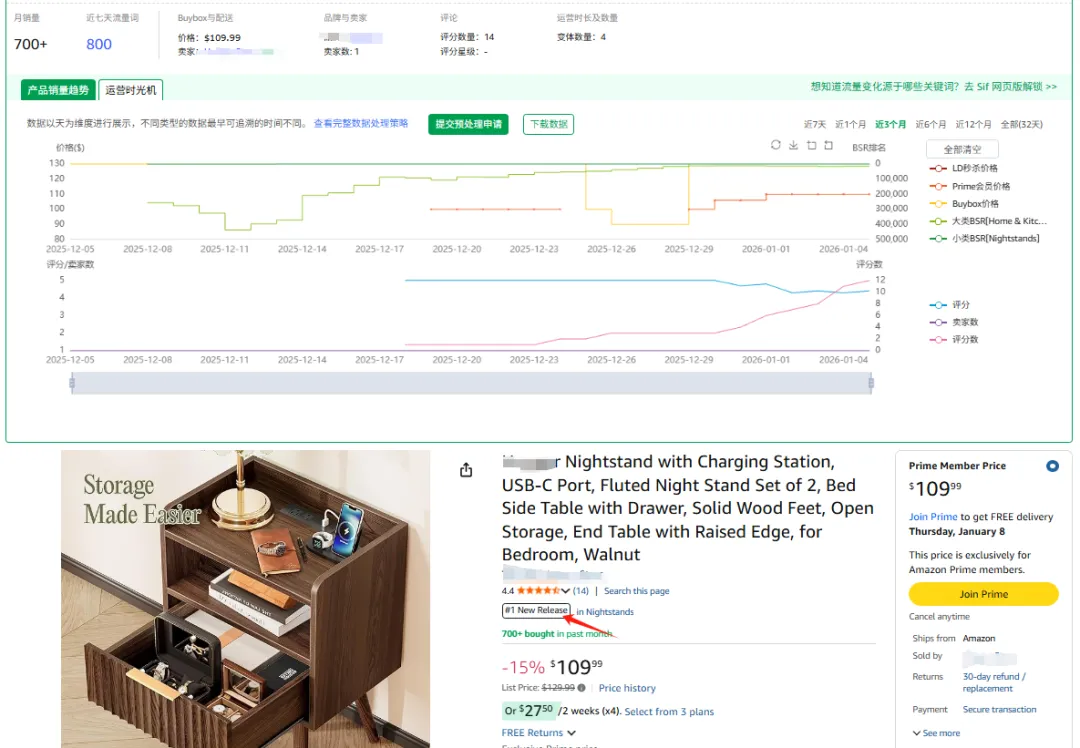 想要优化推荐流量,首先需要明确:哪些推荐专栏带来了流量?核心广告活动是什么?关键引流关键词有哪些?以下结合 2025 年12月上架的床头柜案例(月销 700+、小类排名 前#50、带 NR 标),拆解完整查询流程。