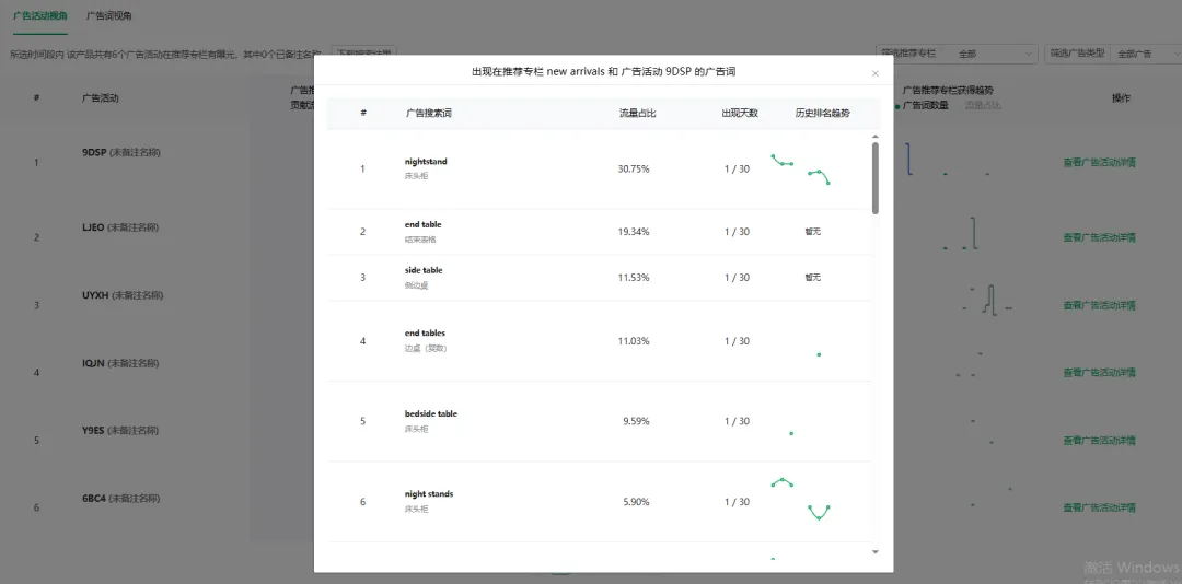 广告活动 9DSP 的核心关键词为 “end table”“nightstand”“nightstand”,流量占比高达 54.35%,远超其他广告活动。