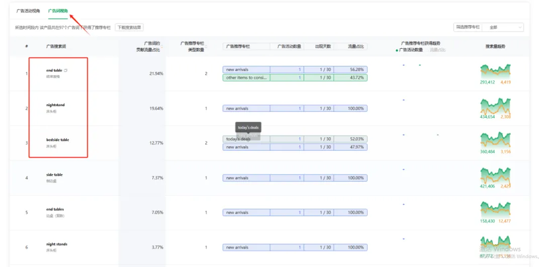 锁定核心引流关键词(如案例中的 “end table”),优化广告组结构,提高关键词出价与匹配度,巩固其在推荐专栏中的排名权重。