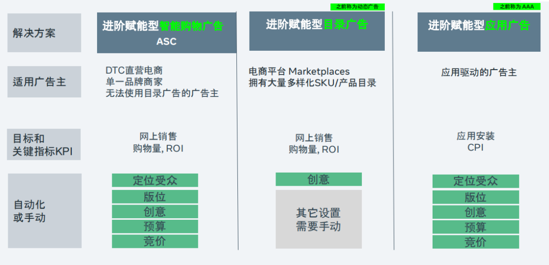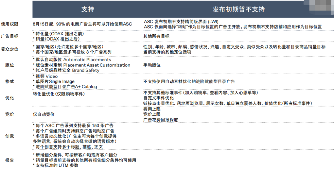 其中,ASC 进阶赋能型智能购物广告支持以下功能: