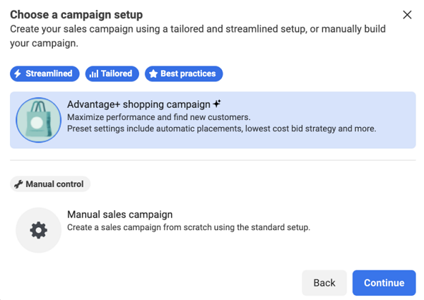 2.在手动设置上勾选 「Advantage + Shopping Campaigns」,然后点击“Continue”