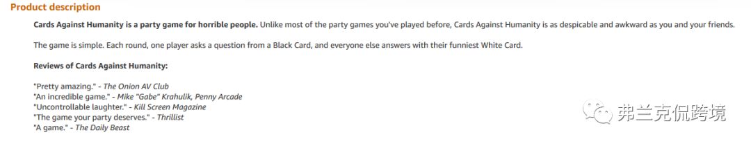这样写的理由是这样的,因为best seller的描述也是这样写的,我抄他的没有错。是的,你这样写不妨碍你成为best seller,因为有可能你的引流技巧很牛逼,产品很牛逼。但是,这样写并不会提升你的产品关键词排名,而且很有可能伤害消费者的整体观感。
