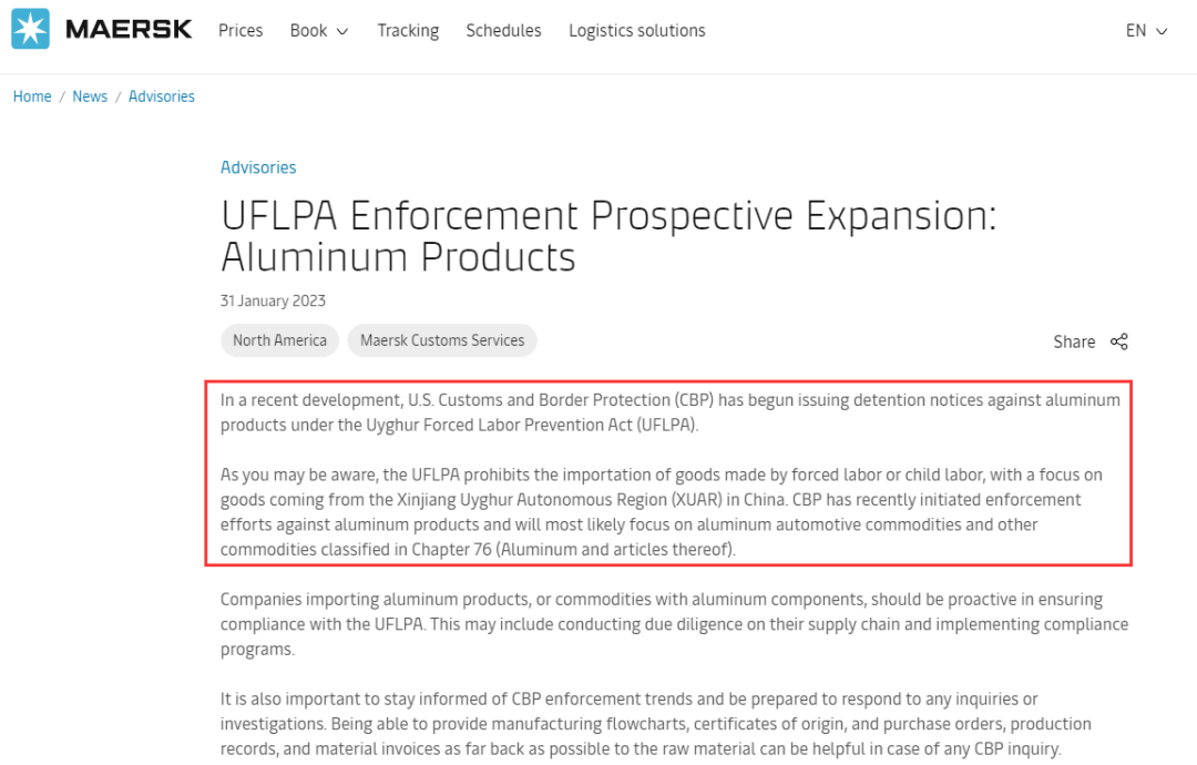近日,全球最大航运公司之一马士基在其官网发布公告,美国已开始扣留进口自中国的铝制品,尤其是来自中国新疆地区的产品。所有进口公司都需要对其供应链进行调查,并实施合规计划。