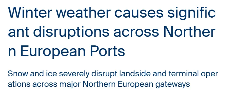 近日,北欧及西欧大范围地区遭遇恶劣冬季天气,港口及内陆运输作业持续受到严重影响。全球知名货代德迅(K+N)及多家船公司发布紧急预警。