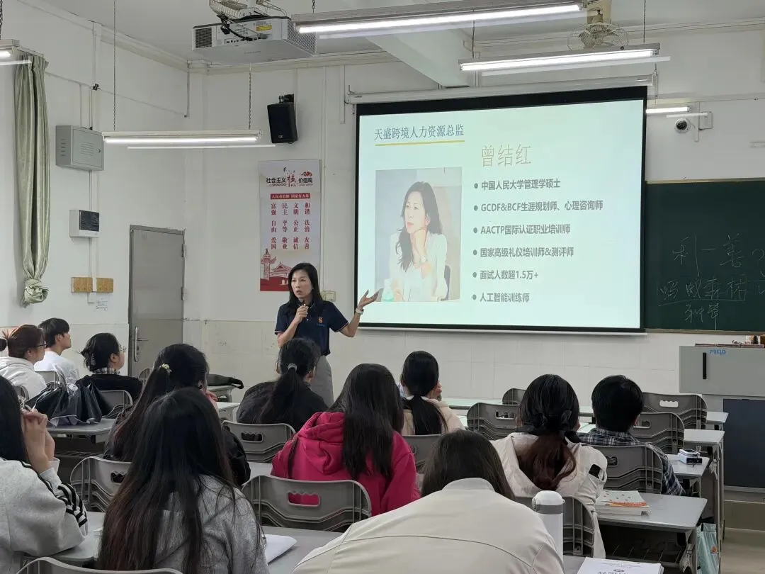 天盛跨境人力总监曾结红女士担任班级宣讲主讲人,以跨境及跨境物流行业等核心数据切入,深度剖析跨境行业爆发式增长机遇;现场系统介绍天盛跨境企业实力与“订单班”特色培养模式,通过“课程共建+项目实战”双驱动,帮助学生提前适应职场节奏,实现“毕业即胜任核心岗位”的无缝衔接,还特别录制过往校友分享成长经验。