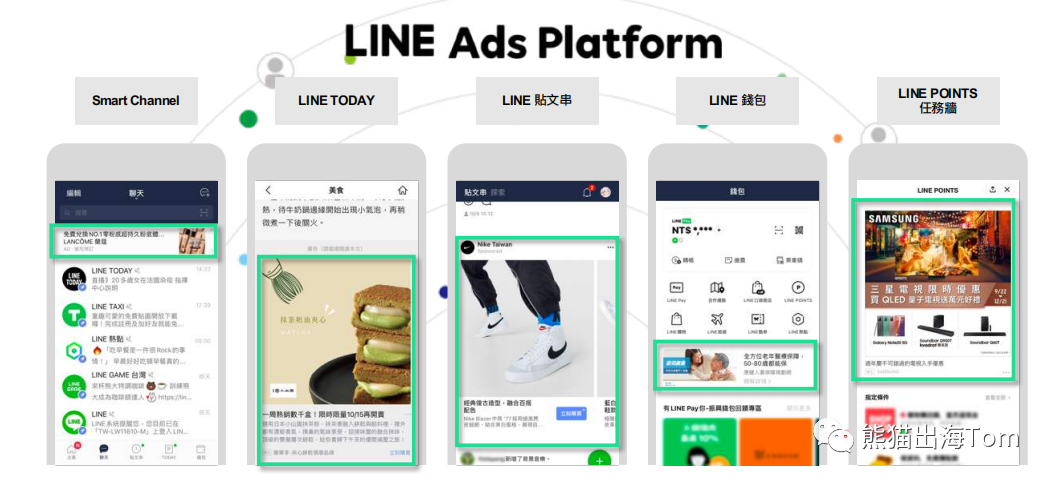 Line是竞价模式的广告投放平台,让宣传素材自然且直觉地出现在9成以上 LINE 用户日常观看的版面,包含LINE聊天列表上方个人化讯息推播、LINE TODAY、贴文串、LINE POINTS 任务墙到 LINE 钱包,素材甚至有机会透过竞价方式,曝光到高价值高曝光的广告版位。