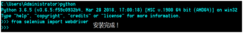 在CMD窗口中输入python,再输入from selenium import webdriver,敲击回车。如果没有报错,则selenium成功安装且能正常使用。