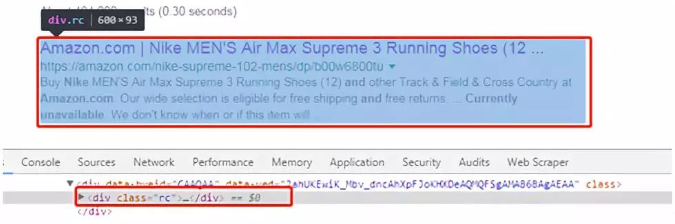 分析Google搜索结果页面,在搜索结果页面按F12。通过分析网页源码,可以看出每个搜索结果都包含在一个class为rc的<div>标签内: