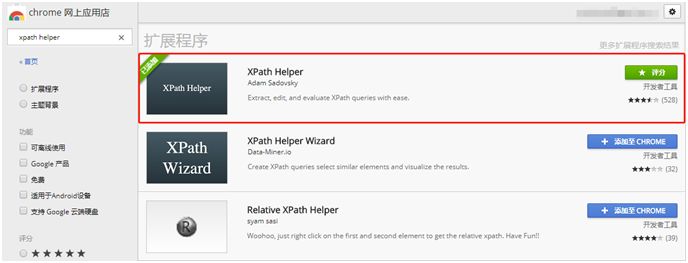 我们可以使用「XPath」来查看是否通过查找所有的class为rc的<div>标签即可找到所有搜索结果。首先下载Chrome插件「XPath Helper」: